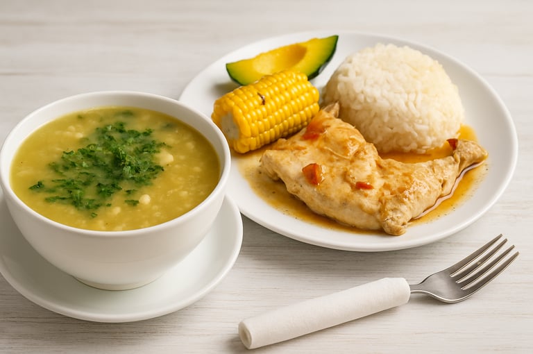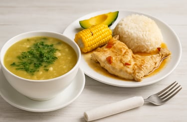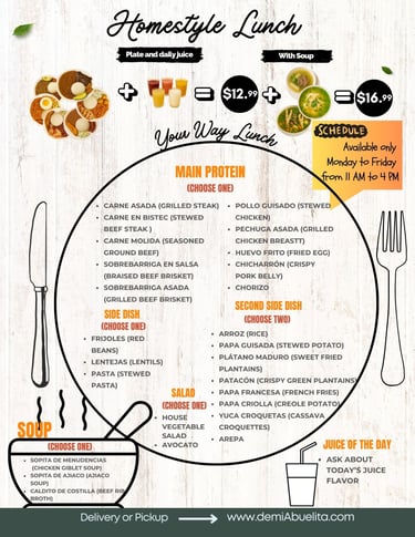 Build your own Colombian lunch plate. Over 1,000 combinations. Choose your protein, sides, and soup. Includes daily juice and salad.